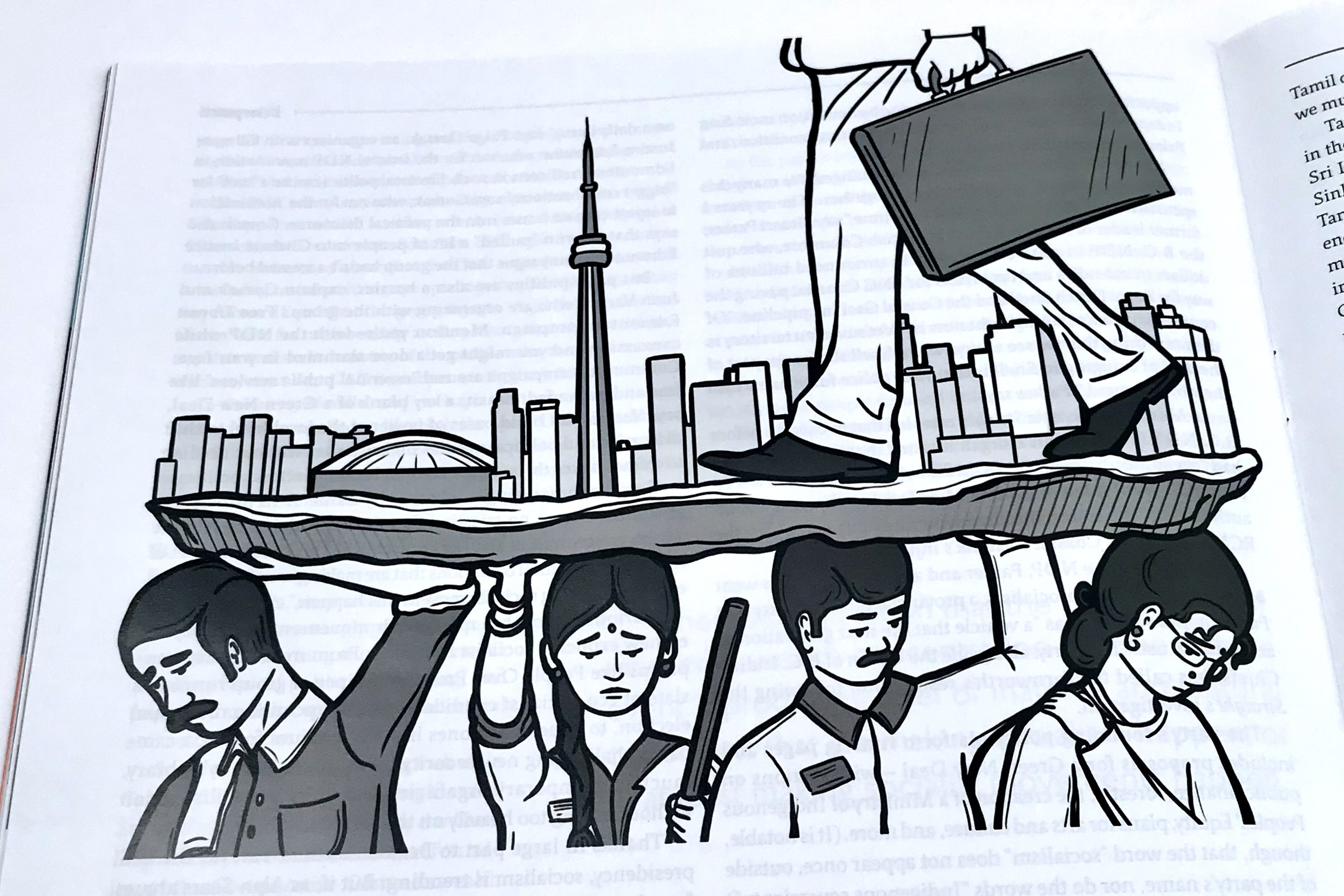 The article thoughtfully speaks on the history of Tamils in Canada and Tamil working class resistance. Through the illustration, I sought to convey this theme, where working class Tamils more often than not shoulder the burden of keeping Toronto running while also illustrating their unequal treatment.