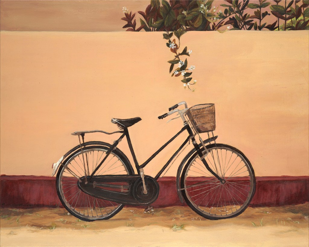 When I started this painting in April 2021, my goal was to capture a memory of when I first visited my parents village back home, for them their first visit after 30+ years. I can still feel the warmth of the sun on one particular morning. Amma was heading out to the temple with my aunts, Appa was riding a bike down the lane. I was making my sister pose for photos, trying to save every moment.